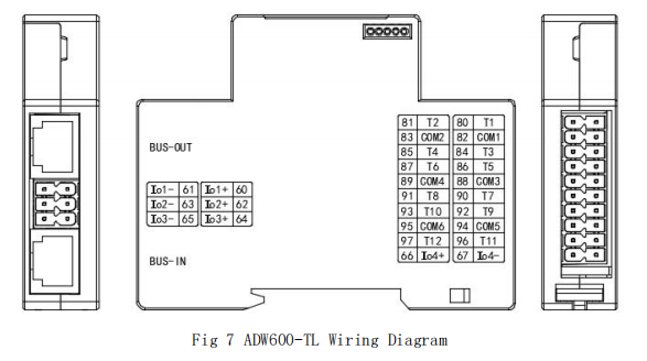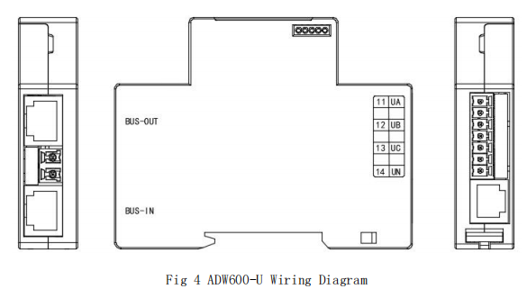 Das Mehrkanalmessmodul ADW600 ist über Ethernet-Kabel miteinander verbunden. BUS-IN ist die Eingangsschnittstelle und BUS-OUT die Ausgangsschnittstelle. Anschließen Sie sie vom ADW600-M oder Power Modul als Ausgangspunkt und fortfahren in der Reihenfolge. Verbinden Sie sich nicht umgekehrt. ADW600-U sollte mit dem Lastspannungssignal verbunden werden. Siehe die Verkabelung unten. Anschließen Sie die Spannungssignale von UA, UB, UC und UN an die Anschlüsse 11-14. Wenn ein dreiphasiges Dreidrahtverbindungsverfahren verwendet wird, verbinden Sie die Spannungssignale von UA, UB und UC mit den Anschlüssen 11-13. Dann Kurzschluss UB zum UN-Terminal.