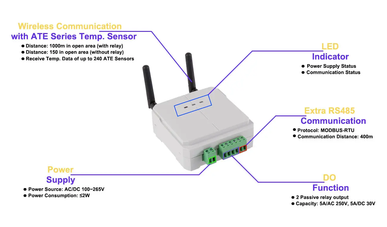 Empfangen Sie Temperaturdaten aus der Ferne von bis zu 240 drahtlosen Temperatursensoren der ATE-Serie