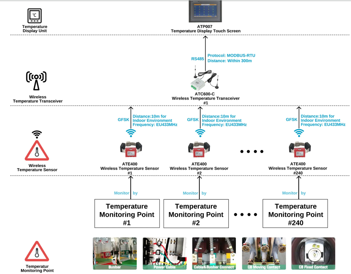 Der drahtlose Temperaturtransceiver Acrel ATC600 kann an Führungsschienen (DIN 35 mm) oder mit Bolzen befestigt werden. Der drahtlose Temperaturtransceiver wird für Temperaturüberwachungssysteme verwendet. Der drahtlose Temperaturtransceiver ATC600 wird verwendet, um Daten von drahtlosen Temperatursensoren ATE100/200/400 zu empfangen. Bis zu 240 Sensoren können angeschlossen werden. Und er überträgt Daten per RS485 Modbus-RTU an SPS, Temperaturmessgerät oder andere Geräte. Der drahtlose Transceiver ATC600 wird mit dem drahtlosen Temperaturmesssystem ARTM verwendet. Er kann in 3–35 kV-Innenschaltschränken verwendet werden, darunter Zentralschränke, Handkarrenschränke, Festschränke, Ringnetzwerkschränke und andere Schaltschränke, und kann auch in 0,4 kV-Niederspannungsschränken verwendet werden, darunter Festschränke, Schubladenschränke usw. Mithilfe der drahtlosen Datenübertragungstechnologie können die Überwachungsdaten in Echtzeit gesendet, die Temperatur vor Ort angezeigt oder eine intelligente Fernüberwachung realisiert werden.