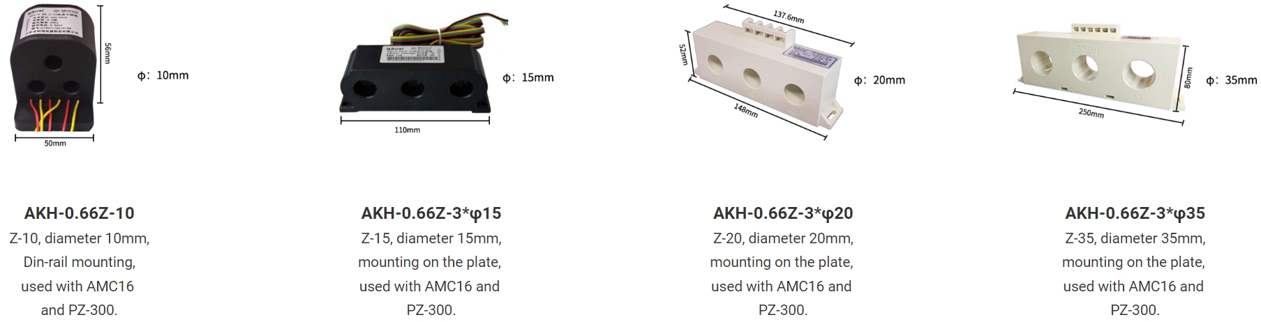 AKH-0.66/Z series combined current transformer is also called three-phase current transformer. As a current signal acquisition device, it is generally matched with multi-loop current monitoring device (AMC16), PZ300, molded case circuit breaker and other products. It can save installation space, reduce cumbersome wiring, convenient to use and effectively reduce the cost.