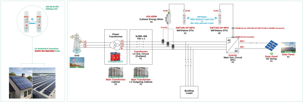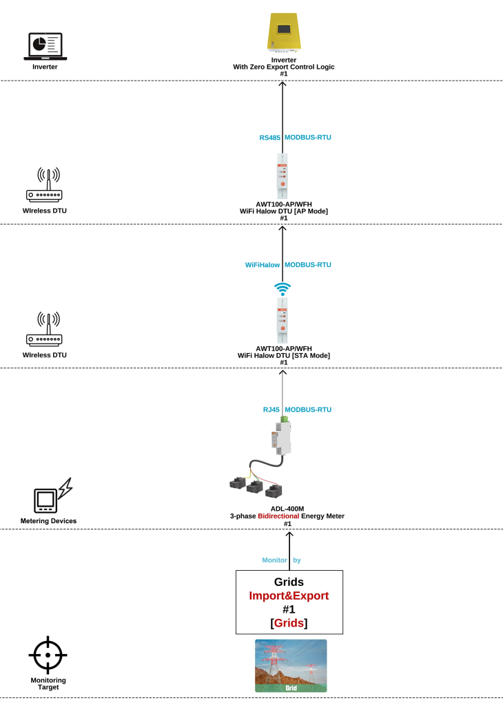 Generally, for the use of the zero-export solar PV inverter, we use RS485 wired communication between the zero-export energy meter, installed at the grid's common connection point, and the inverter, installed at the solar PV site. However, for some sites, RS485 wired communication is not a requirement. Therefore, by using one set of AWT100-AP/WFH, we convert most of the communication between the energy meter and the inverter to WiFi Halow wireless communication.