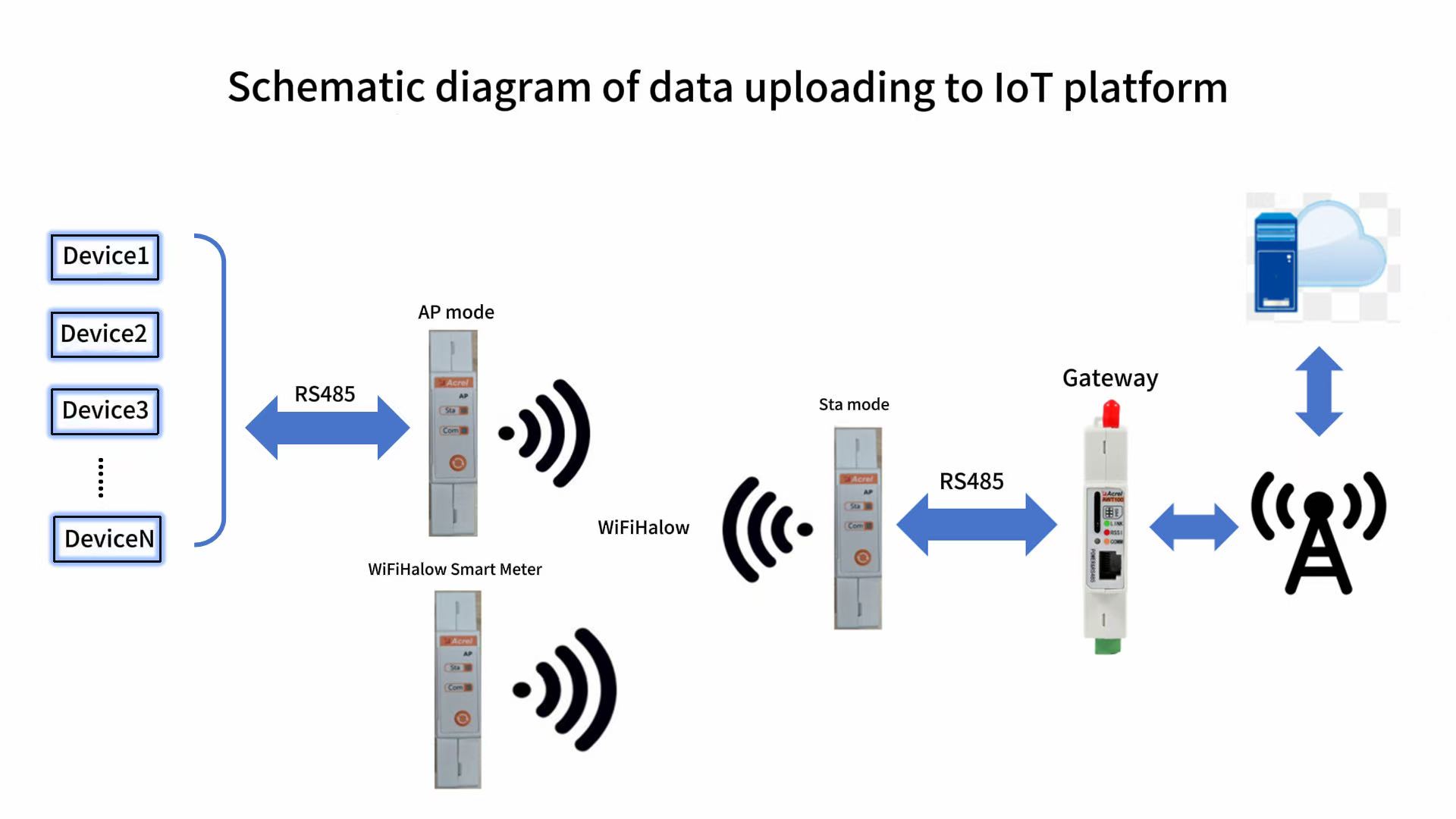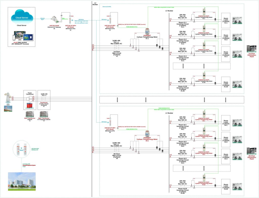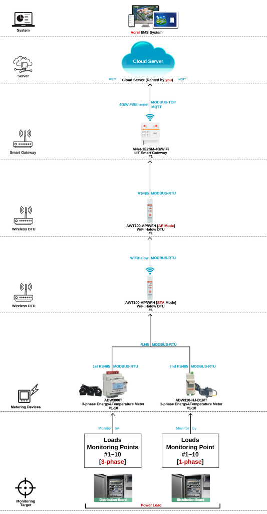 Generally, for EMS power retrofitting, we use RS485 wired communication between the RS485 energy meter and the IoT gateway. However, for some locations, RS485 wired communication is either not required or too expensive for WiFi & 4G wireless energy meters. By using AWT100-AP/WFH sets, we therefore switch most of the communication between the energy meter and the gateway from wireless RS485 to wireless WiFi Halow communication.