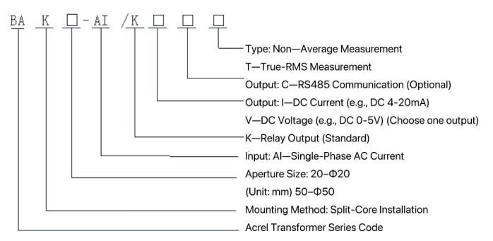 | Entrance | Nominal value | BAK20-AI | Current AC 0.5A, 50A, 200A, etc. AC0~(0.5~200A) |