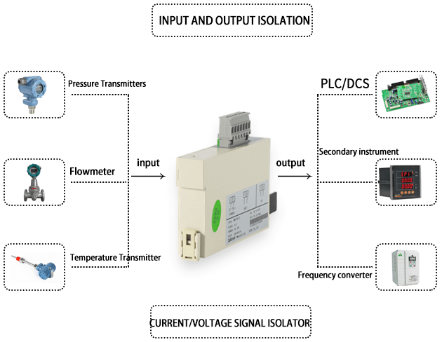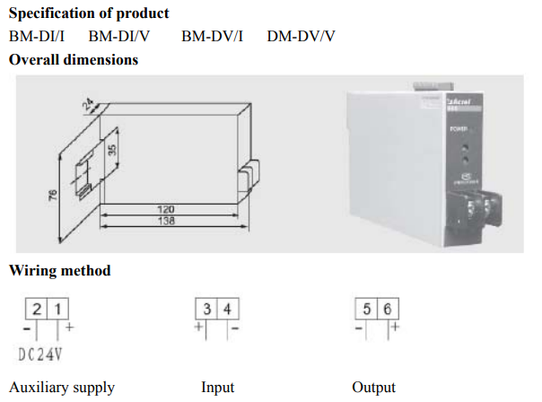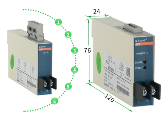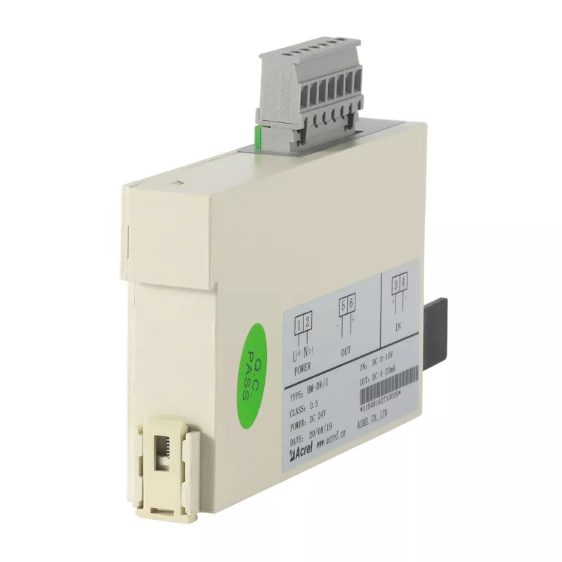 The Acrel BM-DV/I analog signal isolator is a 4-wire isolator with 2 kV, 3-port isolation for all DC and voltage signals, eliminating grounding. It can be equipped with power supplies of various standards. The housing is compact. Mounting is via a TS35 guide rail.