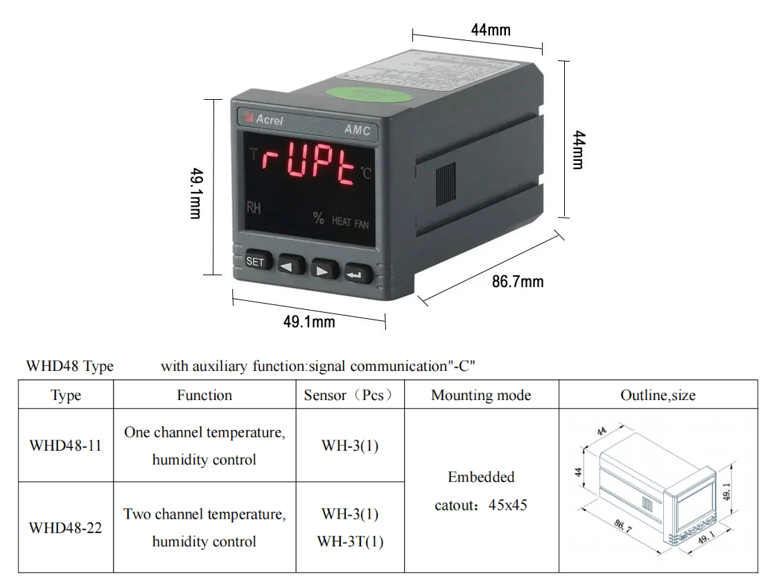 The Acrel WHD48-11 temperature and humidity controller can simultaneously control both temperature (heating or cooling) and humidity (humidification or dehumidification). Simply plug the power cords of your heater/cooler and/or humidifier/dehumidifier directly into the controller's power outlets.