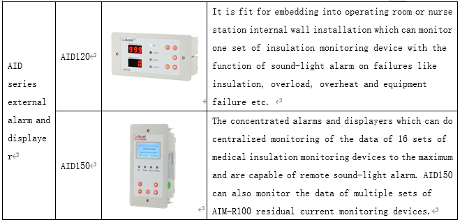 Die Produkte zur Isolationsüberwachung und Fehlerlokalisierung von medizinischen IT-Systemen (Fünf-Stück-Paket) umfassen medizinische Isolationstransformatoren der AITR-Serie, den intelligenten medizinischen Isolationsmonitor AIM-M100, den Stromaustauscher AKH-0,66P26, die Gleichstromversorgung ACLP10-24 und die zentralen Alarmanzeigen der AID-Serie (AID120/AID150), wie in Tabelle 1 dargestellt.